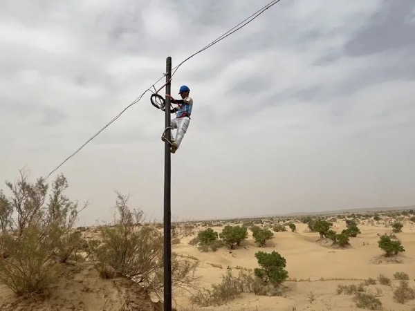 “終于找到線路出問題的地方了!”背著10多公斤工具箱,在40多攝氏度的沙漠里逐個排查故障點近1公里后,艾力·喀迪爾頂著風(fēng)沙向同伴大聲說道。