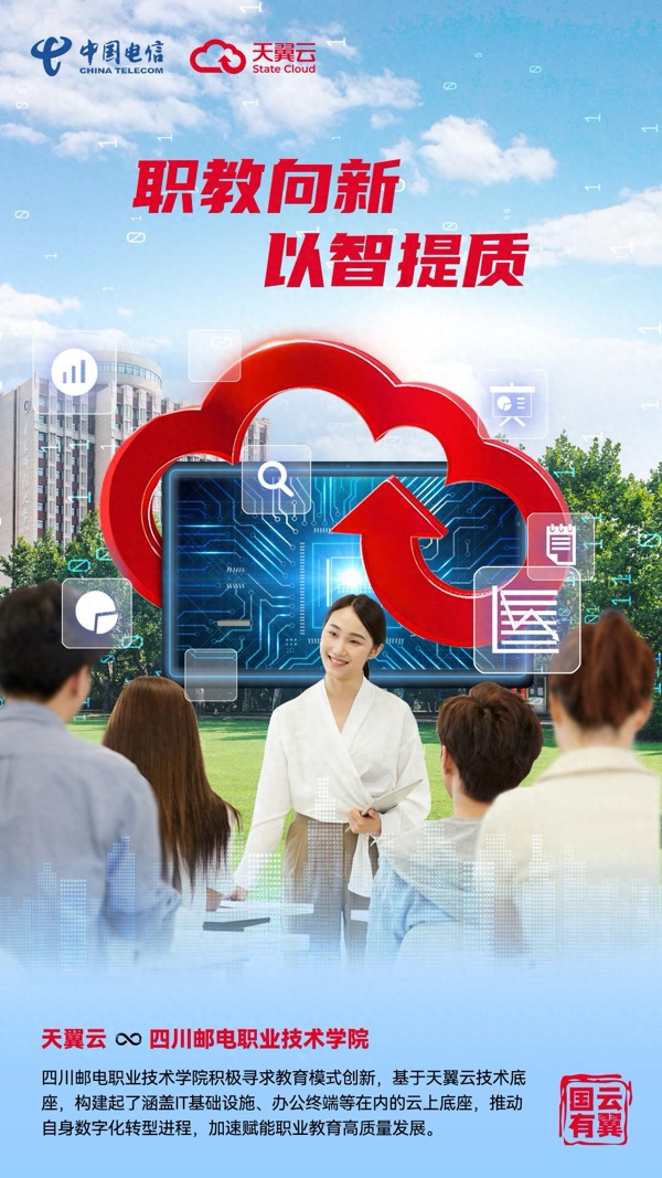 在此背景下,四川郵電職業(yè)技術(shù)學(xué)院(以下簡稱:四川郵電職院)積極尋求教育模式創(chuàng)新,基于天翼云技術(shù)底座,構(gòu)建起了涵蓋IT基礎(chǔ)設(shè)施、辦公終端等在內(nèi)的云上底座,推動自身數(shù)字化轉(zhuǎn)型進(jìn)程,加速賦能職業(yè)教育高質(zhì)量發(fā)展。