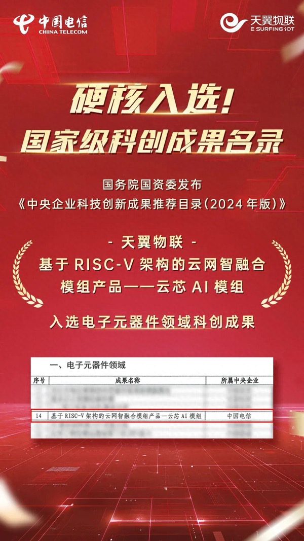 近日,國(guó)務(wù)院國(guó)資委發(fā)布《中央企業(yè)科技創(chuàng)新成果推薦目錄(2024年版)》,中國(guó)電信天翼物聯(lián)“基于RISC-V架構(gòu)的云網(wǎng)智融合模組產(chǎn)品——云芯AI模組”成功入選。此次入選,標(biāo)志著產(chǎn)品在核心技術(shù)自主可控、場(chǎng)景適配能力及產(chǎn)業(yè)協(xié)同創(chuàng)新方面獲得國(guó)家級(jí)平臺(tái)的權(quán)威認(rèn)可,為千行百業(yè)智能化升級(jí)提供標(biāo)桿示范。