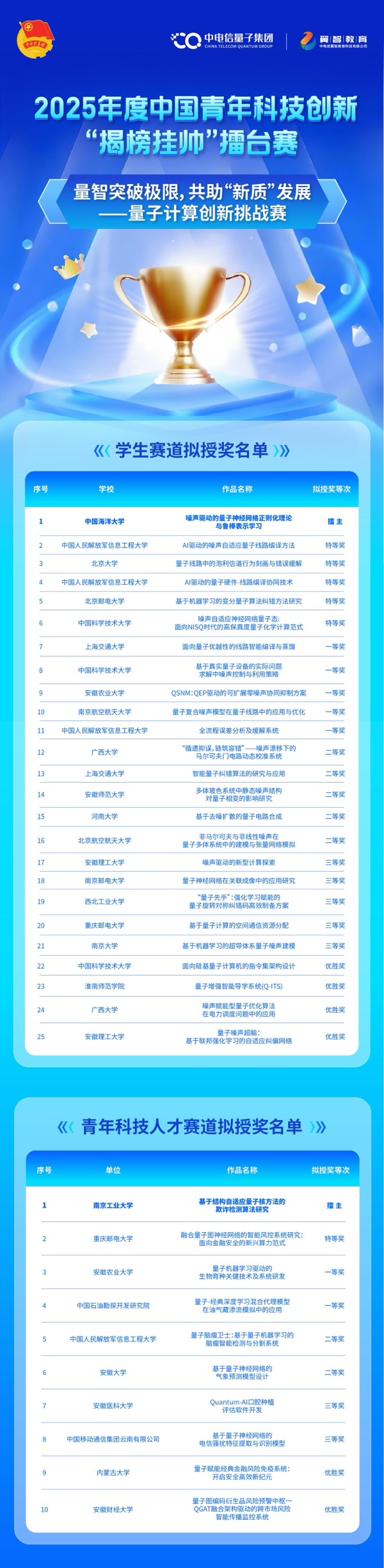 其中,由中國(guó)電信發(fā)榜、中電信量子集團(tuán)實(shí)戰(zhàn)運(yùn)營(yíng)的“量智突破極限,共助‘新質(zhì)’發(fā)展——量子計(jì)算創(chuàng)新挑戰(zhàn)賽”榜題,近百支參賽隊(duì)伍踴躍角逐,最終學(xué)生賽道的25支隊(duì)伍和青年科技人才賽道的10支隊(duì)伍脫穎而出,成功斬獲獎(jiǎng)項(xiàng)。
