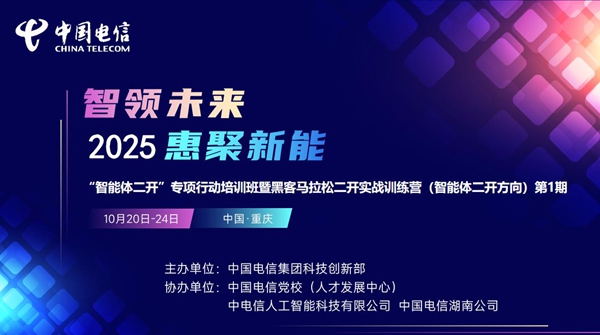 2025年“智能體二開”專項(xiàng)行動(dòng)培訓(xùn)班暨黑客馬拉松二開實(shí)戰(zhàn)訓(xùn)練營(yíng)(智能體二開)第1期于10月20日在重慶正式開班。本次培訓(xùn)由中國(guó)電信集團(tuán)公司科技創(chuàng)新部主辦,聯(lián)合中國(guó)電信黨校、中電信人工智能科技有限公司、中國(guó)電信湖南公司共同協(xié)辦,采取主——中國(guó)電信集團(tuán)、實(shí)——中國(guó)通信服務(wù)股份有限公司、?!须娦湃斯ぶ悄芸萍加邢薰救w協(xié)同的創(chuàng)新賦能模式,吸引了來(lái)自全國(guó)28個(gè)省市及中通服的145名學(xué)員參與。培訓(xùn)以“訓(xùn)-戰(zhàn)-評(píng)”一體化閉環(huán)模式,結(jié)合線上線下教學(xué),旨在通過(guò)實(shí)戰(zhàn)實(shí)訓(xùn)提升學(xué)員在智能體二次開發(fā)方面的能力,推動(dòng)AI技術(shù)規(guī)?;瘧?yīng)用與人才隊(duì)伍建設(shè)。